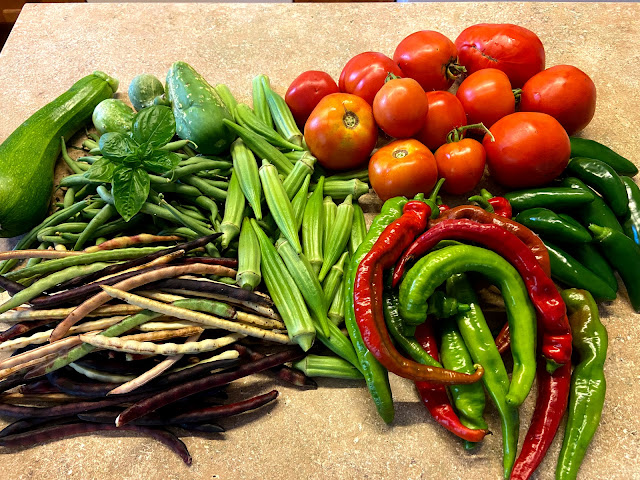 Of course, the garden needed attention - mainly picking. I harvested enough green beans to make about a quart, enough purple hull to shell out a pint, almost 11 pounds of tomatoes and about 3/4 pound of okra. In the afternoon, I processed all the ripe-enough tomatoes. After washing, trimming and quartering, I had about 7 quarts of tomatoes which processed into a bit more than 14 cups of juice. I decided to wait until tomorrow afternoon to can the juice.